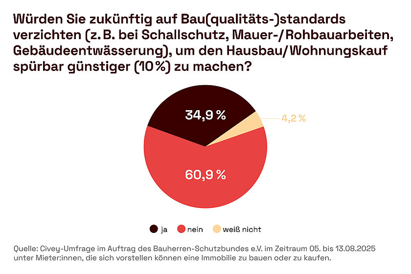 Eine aktuelle Umfrage unter Mieter:innen, die sich den Erwerb von Wohneigentum vorstellen können, zeigt ein klares Bild: Über 60 Prozent lehnen die Absenkung von Baustandards ab, selbst wenn sie dadurch zehn Prozent Baukosten einsparen könnten. Nur ein Drittel der Befragten wäre zu einem Verzicht bereit, während ein kleiner Teil unentschlossen ist. „Die Ergebnisse machen deutlich, dass sich Verbraucher:innen bezahlbares Wohneigentum wünschen – aber nicht auf Kosten der Bauqualität“, erklärt Erik Stange, Pressesprecher des Bauherren-Schutzbundes. „Die große Mehrheit ist nicht bereit, sich auf Abweichungen einzulassen, die sie am Ende teuer zu stehen kommen könnten.“